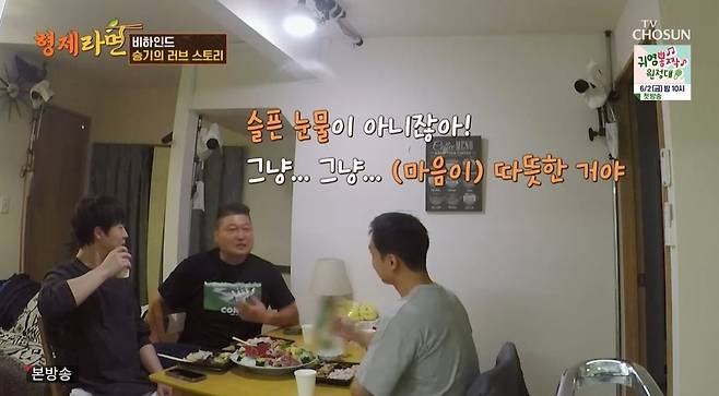 이를 들은 강호동은 눈물을 훔치며 "슬픈 눈물이 아니지 않나. 그냥 마음이 따뜻한 거다. 승기와는 단순한 동료 선후배 사이가 아니지 않다. 오랜만에 연락해도 안 어색하다. 사랑을 많이 받았으니까 더 좋은 배우, 더 좋은 가수, 더 좋은 예능으로 더 큰 즐거움과 행복으로 보답해라"고 조언했다. (사진=TV조선, 디스커버리 채널 코리아 '형제라면' 캡처)