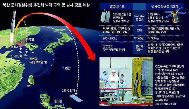 [北 정찰위성 발사 임박] 동창리 발사장서 서해상으로 쏠듯 7년전엔 예고기간중 첫날 발사 1단 추진체, 대천항 300km거리 공해