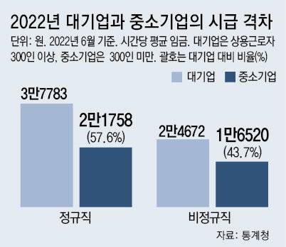 문제는 이 과정에서 생긴 원청과 하청, 대기업과 중소기업 사이 불균형이 고착되면서 임금과 처우 격차가 크게 벌어졌다는 점이다. 지난해 6월 기준 통계청 고용형태별 근로실태조사에 따르면 같은 시간을 일하고 받는 임금(시간당 임금총액)이 300인 이상 대기업의 정규직은 3만7783원, 비정규직은 2만4672원이었다. 300인 미만 중소기업은 정규직이 2만1758원, 비정규직이 1만6520원이었다. 각각 대기업의 57.6%, 43.7%에 불과했다.