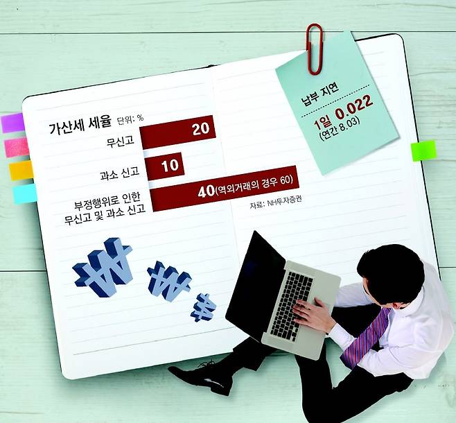 마지막으로 납부 지연 가산세는 납부가 늦어진 것에 따른 이자다. 이는 무신고나 과소신고 시 모두 동일하게 적용된다. 이자율은 1일 0.022%씩 늘어난다. 1년 뒤 납부하면 내야 하는 금액의 8.03%를 추가로 내야 한다. 물론 추가 납부할 세금이 없다면 납부 지연 가산세는 발생하지 않는다.