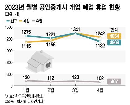 28일 한국공인중개사협회에 따르면 올해 1~4월 전국 공인중개사 사무소 휴업·폐업 수는 총 5321곳에 달한다. 새로 문을 연 사무소가 4969개인데, 문을 닫은 곳이 352개 더 많은 것이다.