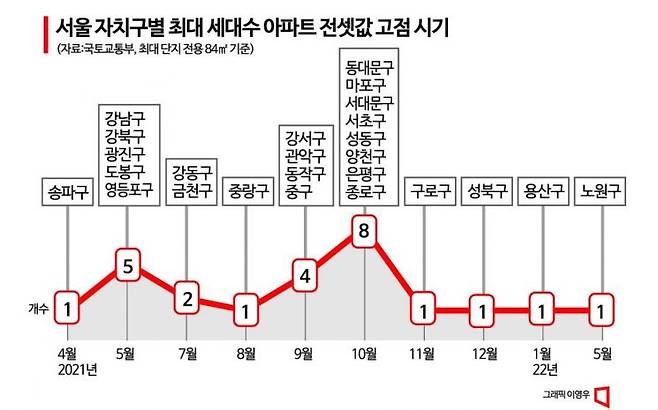 30일 아시아경제가 서울 자치구별로 세대수가 가장 많은 아파트 25곳의 전셋값을 추적한 결과 대부분 2021년 하반기 최고가 집중도가 높았다. 특히 9월과 10월에 가장 많았다. 9월에는 강서구 강서힐스테이트(9억원), 관악구 관악드림타운(7억2000만원), 동작구 신동아리버파크(7억7000만원), 중구 남산타운(8억5000만원)이 각각 최고가를 경신했다. 10월에는 동대문구 래미안위브(9억원), 마포구 마포래미안푸르지오(11억7000만원), 서대문구 DMC파크뷰자이(12억원), 서초구 반포자이(22억원), 양천구 목동신시가지14단지(9억원)이 최고가에 이르렀다.