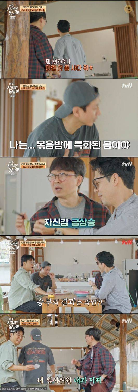 이어 이선균, 장항준의 냉장고 털이 요리 대결이 시작됐다. 이선균은 볶음밥, 장항준은 칼국수를 메뉴로 정했다. 자신감 넘치는 이선균과 달리 장항준은 김남희에게 국물 내기용 조미료를 사다 달라고 부탁해 웃음을 자아냈다. 이선균은 “이거는 이길 수 없다. 나는 볶음밥에 특화된 몸이다”라고 자신감을 드러내며 완성된 음식을 선보였다. 김남희, 김도현은 한입 먹은 후 고개를 끄덕이며 맛을 인정했다.