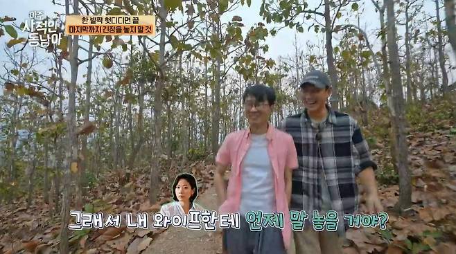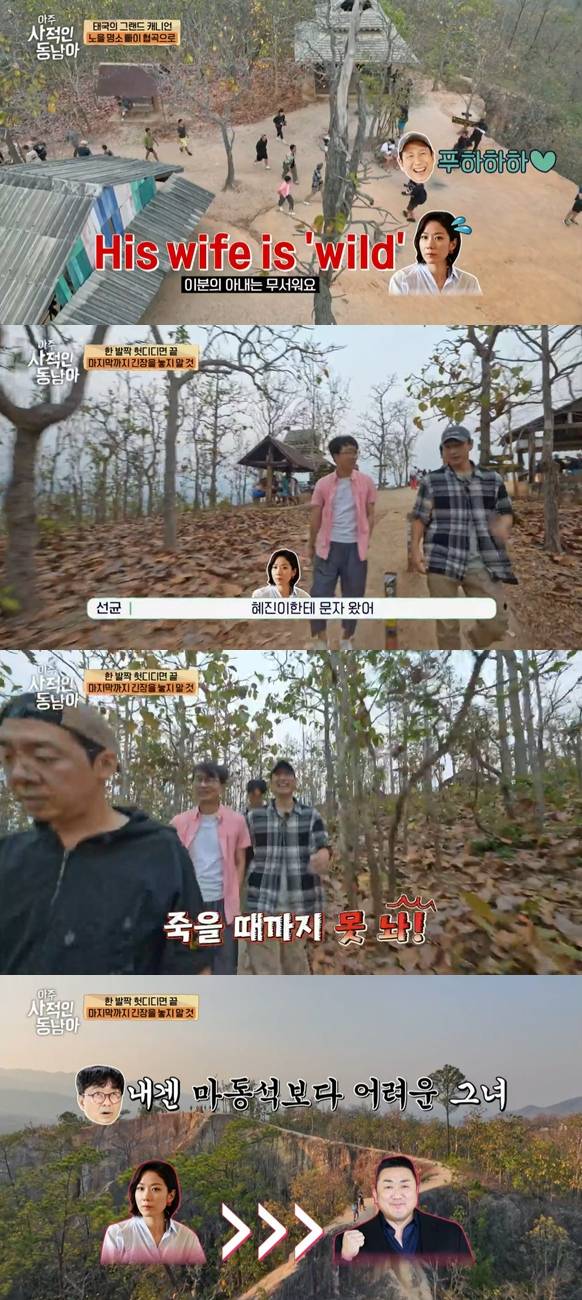 빠이 캐니언 관광을 마치고 내려가던 중 이선균은 아내 전혜진을 언급했다. 그는 "혜진이한테 문자 왔다. '좋나 보다? 연락도 없고?' 하더라"라고 말했다. 이에 장항준은 또 "와일드"를 외쳐 웃음을 자아냈다.