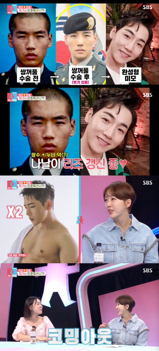 한영은 “사람들이 그러더라. 내가 피부관리를 잘해줘서 예뻐졌다고”라며 “그러고 보니 저번에 어디서 말했더만 쌍꺼풀 수술도 했잖아”라고 박군이 쌍꺼풀 수술했다고 폭로했다.