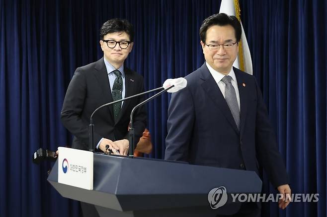 브리핑장 들어서는 한동훈, 정황근 장관