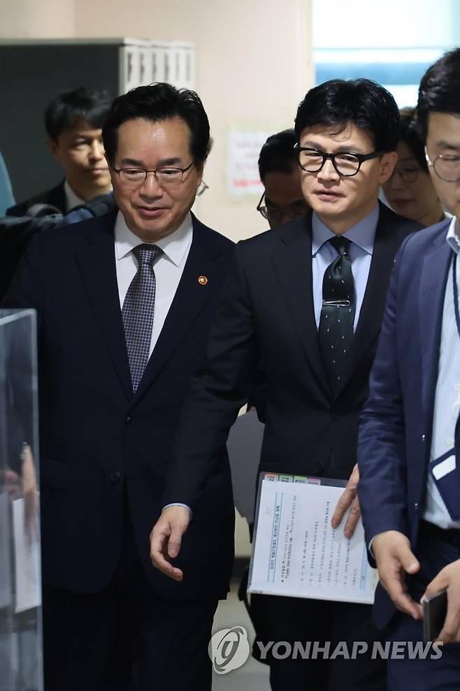 (서울=연합뉴스) 최재구 기자 = 한동훈 법무부 장관과 정황근 농림축산식품부 장관이 30일 농촌 인력난의 해소를 위한 계절근로자 제도의 개선 방안을 브리핑하기 위해 정부서울청사 브리핑실로 들어서고 있다. 2023.5.30