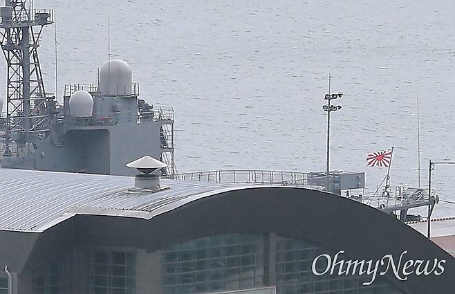 | ▲ 다국적 해양차단훈련 ‘이스턴 앤데버23’에 참가하는 일본 해상자위대 호위함 하마기리함이 욱일기의 일종인 자위함기를 게양한 채로 29일 부산 남구 백운포 해군작전기지에 입항했다. |
