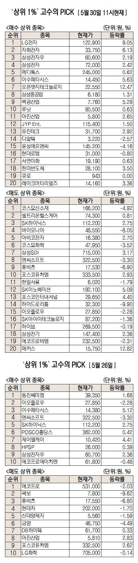이날 미래에셋엠클럽에 따르면 미래에셋증권 주식 거래 고객 중 최근 1개월 간 투자수익률 상위 1%에 해당하는 ‘주식 초고수’들이 오전 11시까지 가장 많이 사들인 종목은 LG전자로 집계됐다.