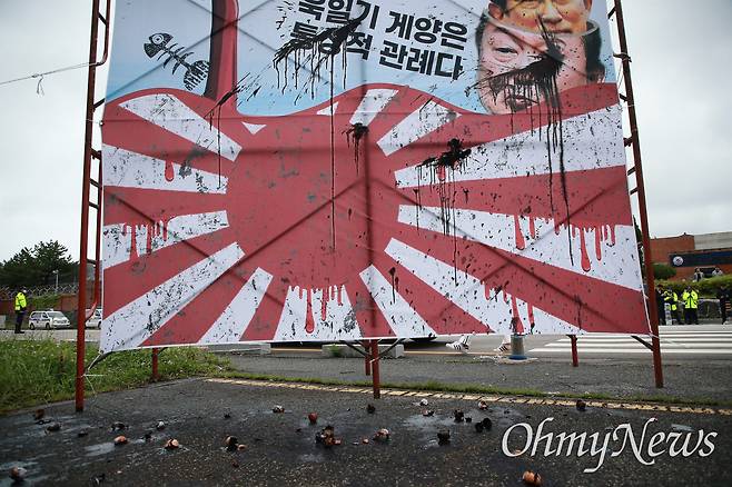 마이크를 잡고 사회를 본 이원규 6·15부산본부 사무처장의 구호를 시작으로 참가자들이 바닥에 있던 먹물 달걀을 던지자 그림은 이내 검은색으로 뒤덮였다. 진행이 끝난 뒤에도 일부는 분을 삭이지 못한 듯 "욱일기는 썩 꺼져라"를 외치며 남아있는 먹물을 모아 달걀 세례를 퍼붓기도 했다.