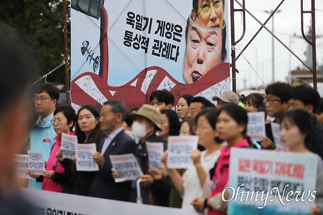 이러한 우려·비난은 바로 상징 행동으로 연결됐다. 이날 시민단체는 윤석열 대통령의 머리 안에 기시다 후미오 일본 총리가 들어있는 욱일기 배경 풍자 그림을 행사장 한편에 설치했다. 중간에는 '욱일기 게양은 통상적 관례'라고 말한 정부 관계자의 발언을, 상단에는 일본의 원전 오염수 해양 방류 모습을 동시에 담았다.