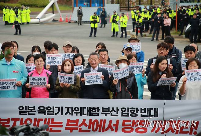 일본의 해상자위대 호위함인 하마기리함이 부산 남구 백운포에 입항한 지 이틀째인 30일. 기지 해군작전기지 입구에서 한 청년의 목소리가 갈수록 높아지기 시작했다. 이승민 부산대학생겨레하나 대표는 "어떻게 우리 정부가 일본 함정이 전범기를 당당히 내걸 수 있도록 명분을 줄 수 있느냐"라며 "오염수에 욱일기에, 그 다음은 무엇일지 겁이 난다"라고 걱정스러운 표정을 지었다.