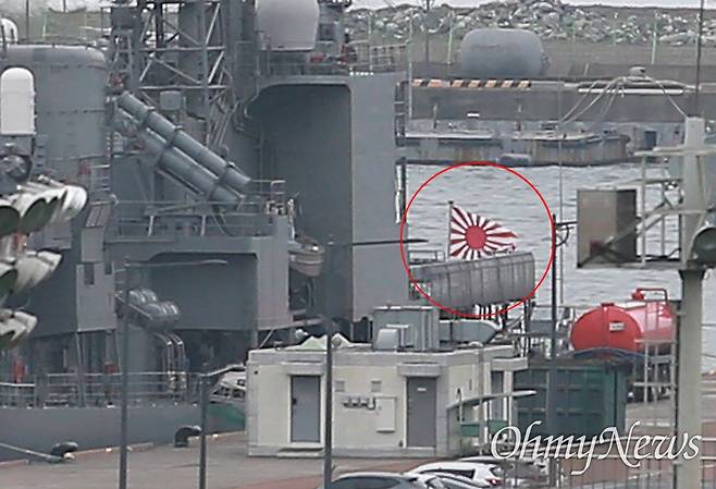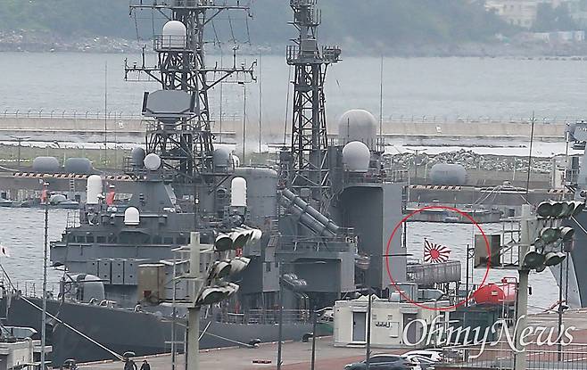 | ▲ 30일 다국적 해양차단훈련 ‘이스턴 앤데버23’에 참가하는 일본 해상자위대 호위함 하마기리함이 욱일기의 하나인 '자위함기'를 게양한 채로 30일 부산 남구 백운포 해군작전기지에 입항해 있다. |