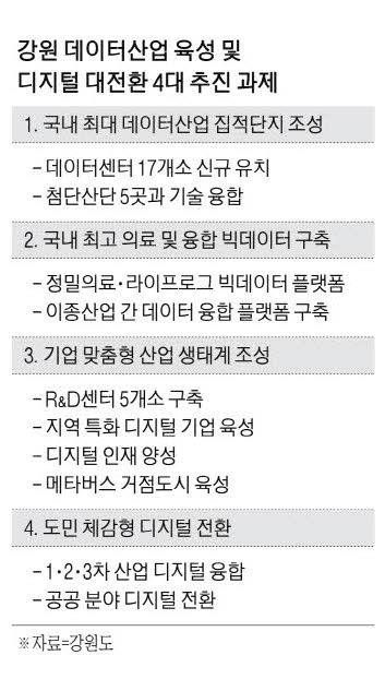 강원도는 이러한 강점을 살려 데이터산업 기반을 더 단단하게 다지고, 각종 산업과 융합해 진정한 데이터 수도 완성과 디지털 대혁신을 이루겠다는 방침이다. △국내 최대 데이터산업 집적단지 조성 △국내 최고 의료 및 융합 빅데이터 구축 △기업 맞춤형 데이터산업 생태계 조성 △도민 체감형 디지털 전환을 중점 과제로 정하고 올해부터 2028년까지 10개 분야, 46개 단위 시책을 단계적으로 추진한다. 사업비로만 1조3227억원이 투입될 예정이다.