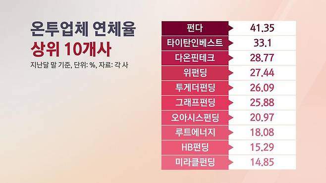 연체율이 가장 높은 곳은 펀다로 무려 41.35%였습니다. 타이탄인베스트(33.1%), 다온핀테크(28.77%), 위펀딩(27.44%) 등이 뒤를 이었습니다. 대출 잔액 2위 업체인 투게더펀딩도 26.09%로 연체율 상위 5개사에 포함됐습니다.