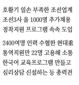 회사 측은 외국인 근로자의 한국 생활 적응을 돕기 위해 전문 통역인력을 채용하고 매주 한국어와 한국 문화를 익힐 수 있는 프로그램을 마련하고 있다. 정부도 외국인 근로자 주거비 지원을 비롯해 이주 정착을 돕고 있다. 비숙련 외국인 근로자(E-9 비자)의 조선업 현장 투입에 속도를 가해 인력 공백을 최소화하겠다는 방침이다.