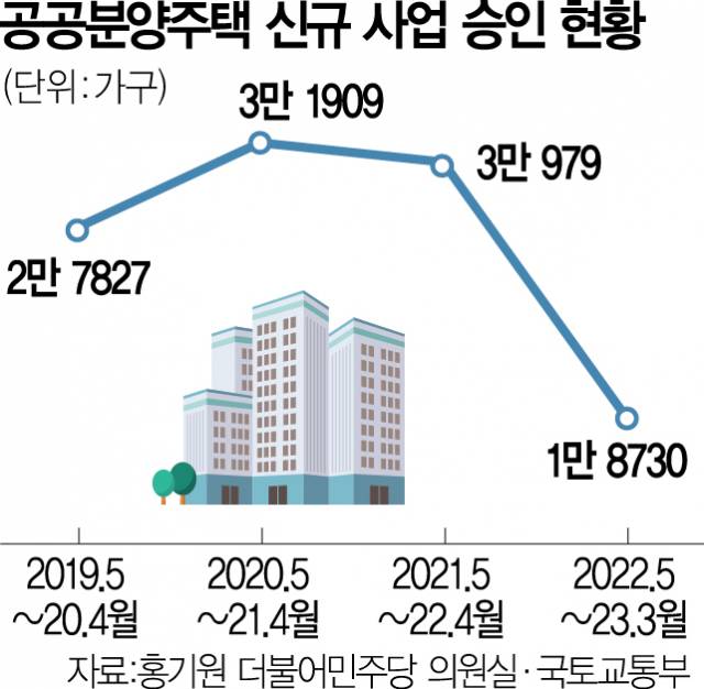 2022년 5월부터 올 3월까지 수도권 공공분양 신규 사업 승인 물량은 6410가구로 직전 1년(2만 6706가구) 대비 76%나 줄었다.