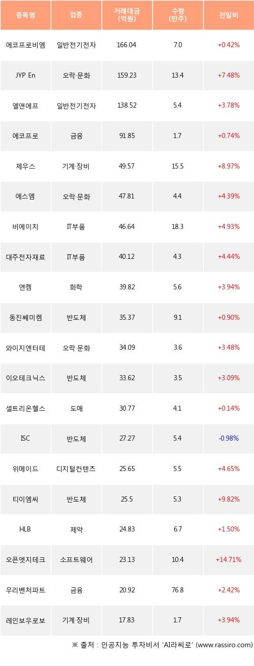 에코프로비엠, JYP Ent., 엘앤에프 등은 전일 대비 주가가 상승했고, ISC 등은 주가가 하락했다.