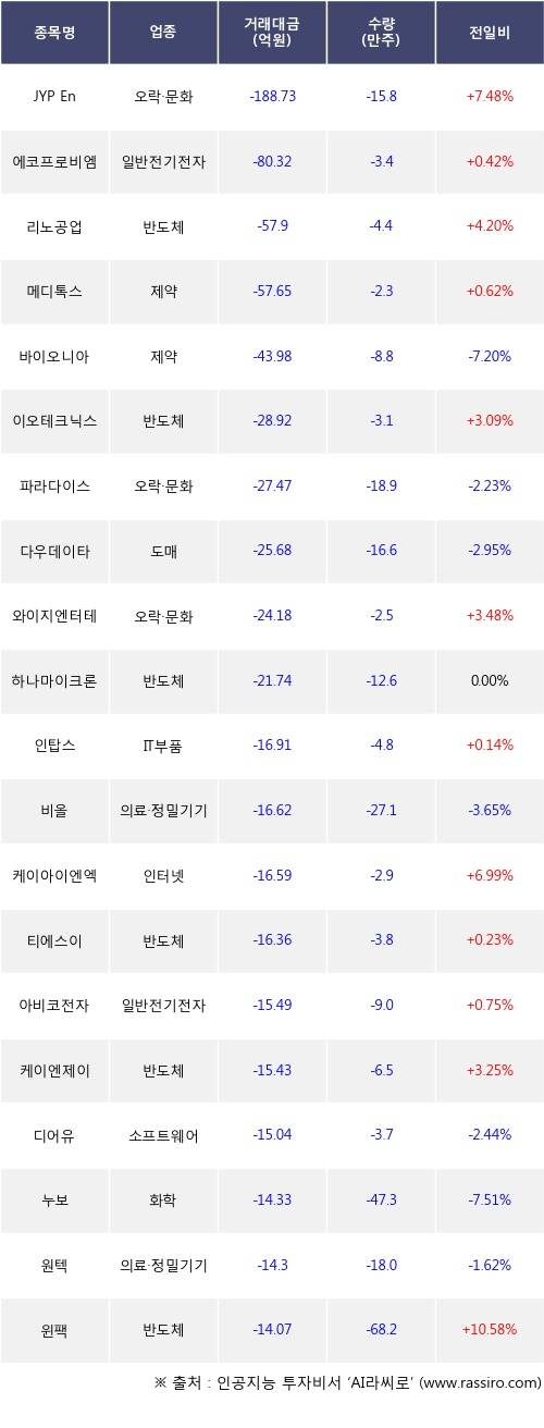 외국인 투자자의 순매도 상위 20개 종목은 JYP Ent., 에코프로비엠, 리노공업, 메디톡스, 바이오니아, 이오테크닉스, 파라다이스, 다우데이타, 와이지엔터테인먼트, 하나마이크론등이다.