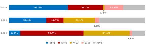 수입액으로 보면, 약 3천400만달러에서 1억3천800달러로 급등했습니다. 또 다른 경쟁국인 독일의 경우 2019년 1.3%에서 2021년 34.1%로 2위에 올라섰습니다.