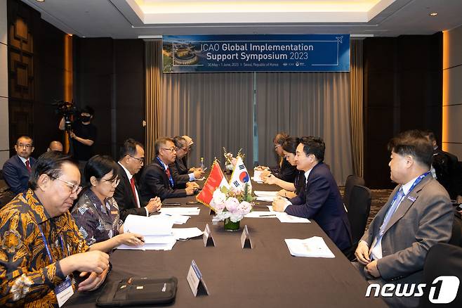 (서울=뉴스1) 김진환 기자 = 원희룡 국토교통부 장관이 30일 서울 영등포구 여의도에서 개최된 'ICAO 글로벌 이행지원심포지엄 2023(GISS 2023)'에서 부디 카야 수마디 인도네시아 교통부 장관과 면담하고 있다. (국토교통부 제공) 2023.5.30/뉴스1