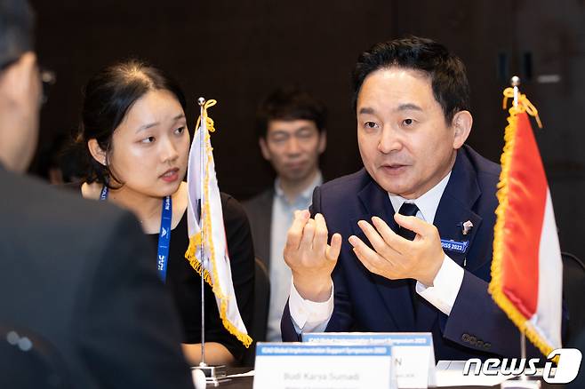 (서울=뉴스1) 김진환 기자 = 원희룡 국토교통부 장관이 30일 서울 영등포구 여의도에서 개최된 'ICAO 글로벌 이행지원심포지엄 2023(GISS 2023)'에서 부디 카야 수마디 인도네시아 교통부 장관과 면담하고 있다. (국토교통부 제공) 2023.5.30/뉴스1