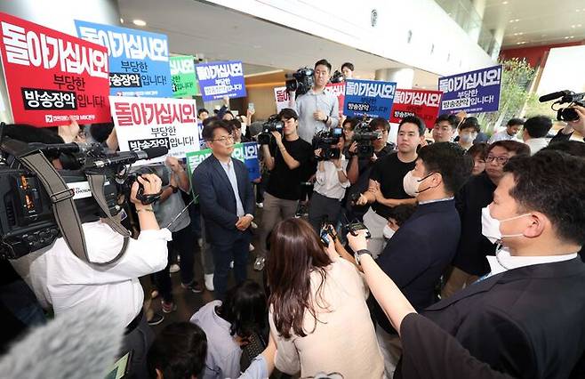 경찰은 오전 11시40분쯤 MBC 사옥에 도착했는데요, 전국언론노조 MBC본부(MBC 노조)의 조합원들이 집결하면서 로비 대치가 시작됐습니다. 조합원들은 '돌아가십시오! 부당한 방송장악입니다!'라고 적힌 손팻말을 들고 경찰의 진입을 막았습니다.