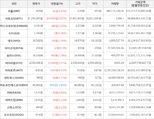 가상화폐 시세 (제공: 암호화폐 거래소 업비트)현재 암호화폐 거래소 "업비트"에 따르면 가상화폐 대장 격인 비트코인의 시세는 전일 대비 303,000원(0.82%) 상승한 37,295,000원에 거래되고 있다.