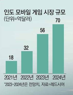 컨설팅회사 레드시어에 따르면 인도 모바일 게임 시장규모는 2021년 18억달러(2조3890억원)를 기록했으나 오는 2024년에는 70억달러(9조2900억원)로 3년 새 4배 가량 커질 전망이다. 나아가 게임 유저 수는 2021년 3억3990만명으로, 중국에 이어 전 세계 2위를 차지했다. 이 수치는 오는 2025년 5억2910만명을 돌파할 것으로 예상되고 있다.