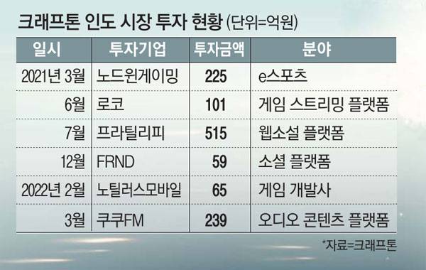 30일 정보기술(IT) 업계에 따르면 크래프톤은 지난 2021년 인도 법인 설립 이래 현지 기업에 1200억원이 넘는 투자를 단행한 것으로 집계됐다. 2021년 3월 인도 최대 e스포츠 기업인 노드윈 게이밍에 225억원을 투자한 것으로 시작으로 게임 스트리밍 플랫폼인 로코, 게임 개발사인 노틸러스 모바일 등에 잇달아 투자했다. 투자 분야도 게임 부문을 넘어 웹소설과 소셜 플랫폼, 오디오 콘텐츠 기업을 아우른다.