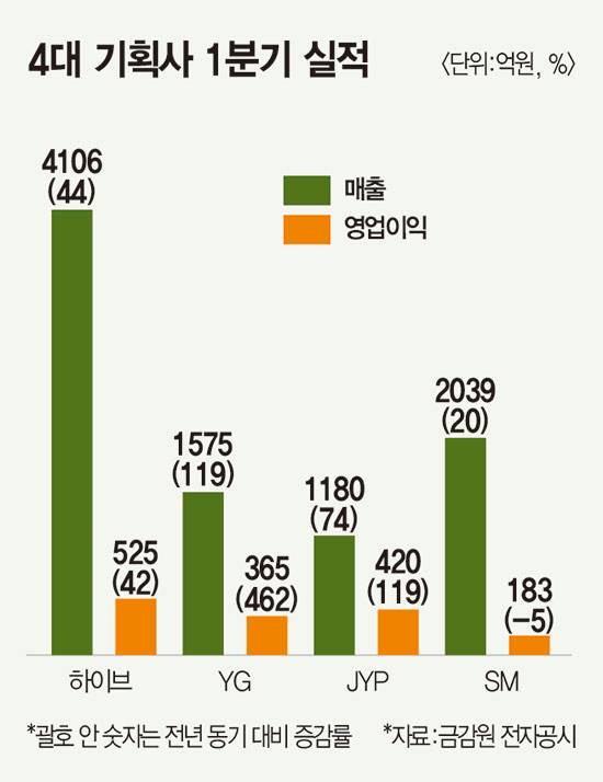 1위는 단연 하이브다. 1분기 매출 4106억원, 영업이익 525억원으로 모두 업계 1위다. 지난해 같은 기간보다 각각 44%, 42% 성장했다. 그룹 방탄소년단(BTS) 군 입대가 시작돼 우려가 있었지만, 멤버 지민의 솔로 앨범이 초동 판매량 145만장을 넘어서며 호실적을 견인했다. 지난해 데뷔한 뉴진스와 르세라핌을 비롯해 세븐틴, 투모로우바이투게더 등 산하 레이블 소속 아티스트들이 뛰어난 성과를 거둔 것도 한몫했다.