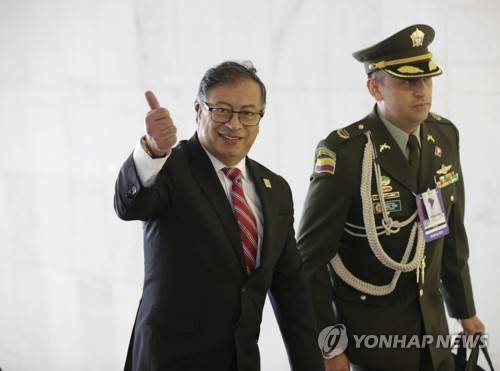 Colombia's President Gustavo Petro gives a thumbs up upon arrival for the South American Summit at Itamaraty palace in Brasilia, Brazil, Tuesday, May 30, 2023. South America's leaders are gathering as part of President Luiz Inácio Lula da Silva's attempt to reinvigorate regional integration efforts. (AP Photo/Gustavo Moreno)