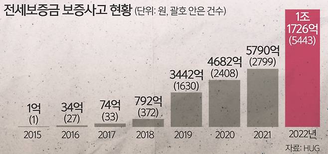 해가 지날수록 전세대출과 보증보험에 기댄 허술한 전세의 역풍이 닥치기 시작했다. 주택도시보증공사(HUG)에 따르면 전세보증금 보증사고는 2016년 27건(34억원)에서 2017년 33건(74억원)으로 소폭 상승했고, 2017년 보증 한도가 전세가율 100%까지 오른 뒤로는 2018년 372건(792억원)으로 10배 급증했다. 이후 상승세를 지속하며 2022년에는 5443건(1조1726억원)까지 올랐다. 임대인이 돌려주지 않은 이 돈은 결국 임차인, 혹은 보증보험에서 빠져나가고 있다.
