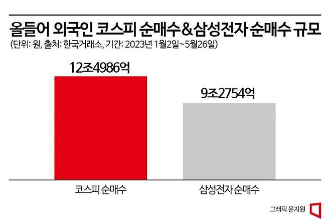 이미 반도체 업황 개선 기대감은 외국인의 삼성전자 순매수 행렬에서도 확인되고 있다. 외국인들은 올 들어(1월2일~5월26일) 코스피에서만 총 12조4986억원치 주식을 사들였는데, 이 중 약 75%에 달하는 9조2754억원을 삼성전자에 쏟아부었다. 2020년~2022년 코로나19 팬데믹(세계적 대유행) 기간 3년 연속 삼성전자를 순매도했던 것과는 180도 달라진 모습이다.