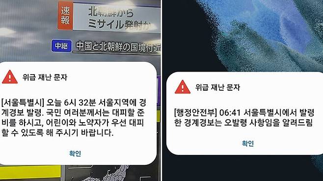 하지만 행안부는 7시 3분 "06:41 서울특별시에서 발령한 경계경보는 오발령 사항임을 알려드림"이라는 위급재난문자를 보냈습니다.