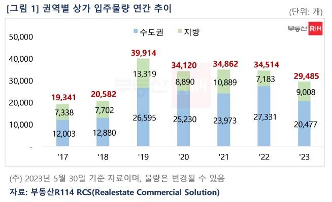 부동산R114가 전국 상가 입주물량을 집계한 결과, 2023년 입주상가는 2만9485개로 지난해 3만4514개에 비해 5029개 줄어든 것으로 나타났다. 권역별로 수도권 2만477개, 지방 9008개로 각각 집계됐다. 지방은 지난해 7183개에 비해 입주상가 수가 25% 늘었다.