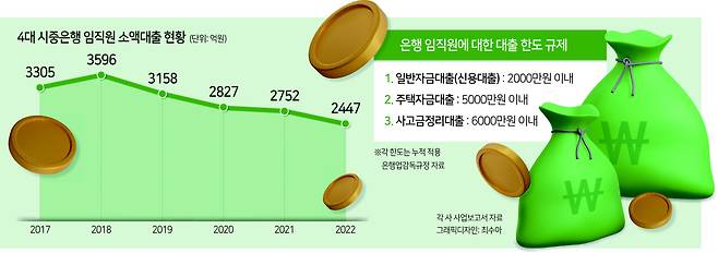 “은행원도 연차를 내 다른 은행을 간다”는 말이 우스갯소리가 아니다. 주요 은행이 자사 임직원에 제공하는 대출금액이 해마다 크게 줄고 있다. 이자장사로 성과급 잔치를 벌였다는 비판에 은행이 자사 임직원의 대출 금리를 다른 상품에 비해 높게 책정하는 등 헤택을 줄이고 있기 때문이다. 직원 사이에서는 ‘역차별’이라는 불만이 쇄도하지만, 꾸준히 발생하는 금융사고 방지를 위한 합리적인 처사라는 반박도 나온다.