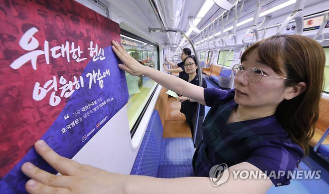 (수원=연합뉴스) 홍기원 기자 = 31일 오전 경기도 수원시 영통구 신분당선 광교차량기지에서 열린 호국보훈열차 개통식에서 관계자가 홍보물을 부착하고 있다.