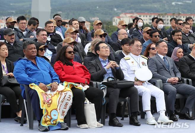 [서귀포=뉴시스] 우장호 기자 = 31일 오전 제주민군복합항 항내에서 한국과 미국, 일본, 호주 등이 참여하는 확산방지구상(PSI) 다국적 해상 약식절차 훈련이 진행되고 있다. 마라도함 선상에서 대량살상무기(WMD) 전파를 차단하기 위한 PSI 고위급 회의에 참석자들이 훈련 모습을 지켜보고 있다. 2023.05.31. woo1223@newsis.com