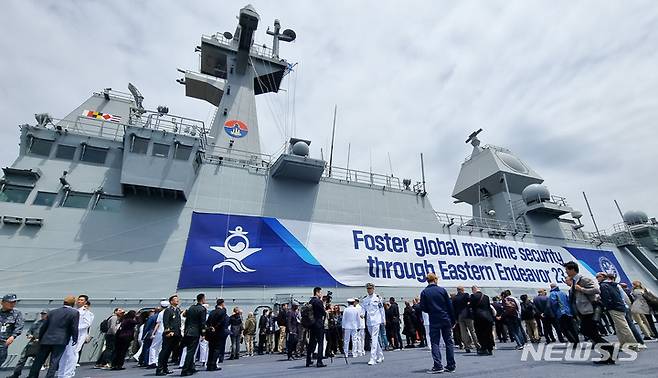 [서귀포=뉴시스] 우장호 기자 = 31일 오전 제주민군복합항 항내에서 한국과 미국, 일본, 호주 등이 참여하는 확산방지구상(PSI) 다국적 해상 약식절차 훈련이 진행되고 있다. 마라도함 선상에서 대량살상무기(WMD) 전파를 차단하기 위한 PSI 고위급 회의에 참석자들이 훈련 모습을 지켜보고 있다. 2023.05.31. woo1223@newsis.com