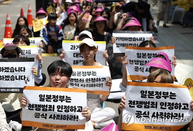 (서울=연합뉴스) 신준희 기자 = 31일 종로구 주한일본대사관 앞 평화의소녀상 인근 도로에서 정의기억연대 주최로 일본군 위안부 피해자 문제해결을 위한 정기 수요시위가 열리고 있다. 2023.5.31