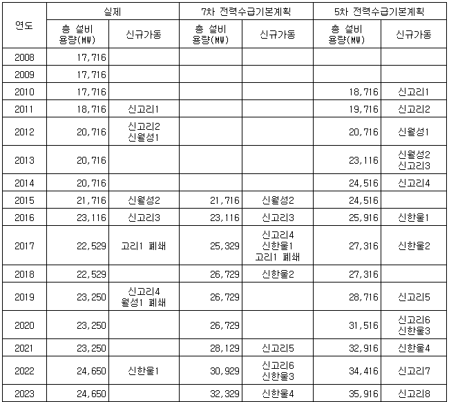 <자료 = 정부 제5차 전력수급기본계획, 제7차 전력수급기본계획, 한국수력원자력 원전운영정보 데이터 취합>