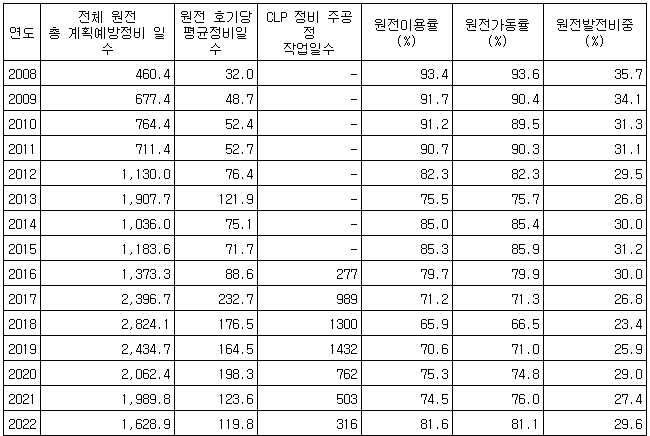 [표] 국내 원전 계획예방정비 일수 및 원전 이용률 현황
