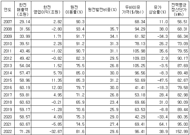 [표] 한국전력 영업실적와 원전 이용률, 국제유가