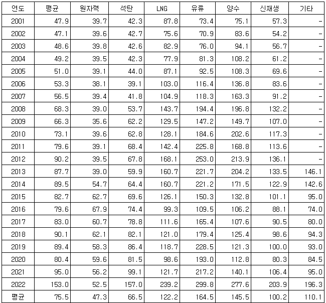 [표] 발전원별 전력 정산단가(2001~2022년)
