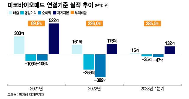 하지만 미코바이오메드 실적은 2020년을 고점으로 역성장이 이어지고 있다. 2021년 매출액은 303억원으로 전년 대비 33.7% 줄었고, 영업손실 109억원으로 1년 만에 적자전환했다.