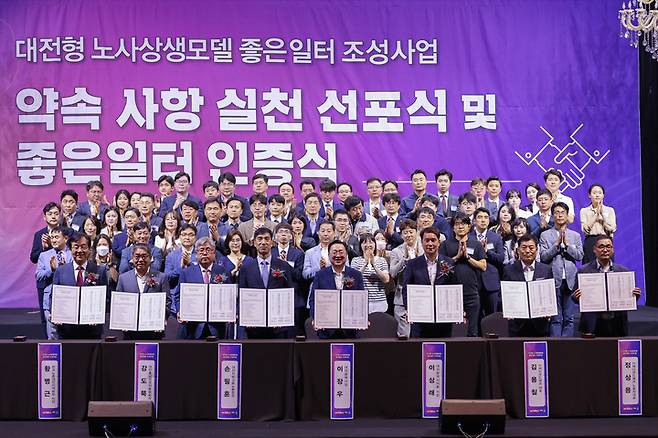 대전형 노사상생모델인 '좋은일터 조성사업'은 지역의 일터를 개선하고 양질의 일자리를 창출하기 위한 사업으로, 주52시간 근무제 준수를 비롯한 필수과제와 비정규직 보호, 원·하청 관계개선 등 6개 선택과제 등을 이행하면 지원금을 지급하는 제도다.