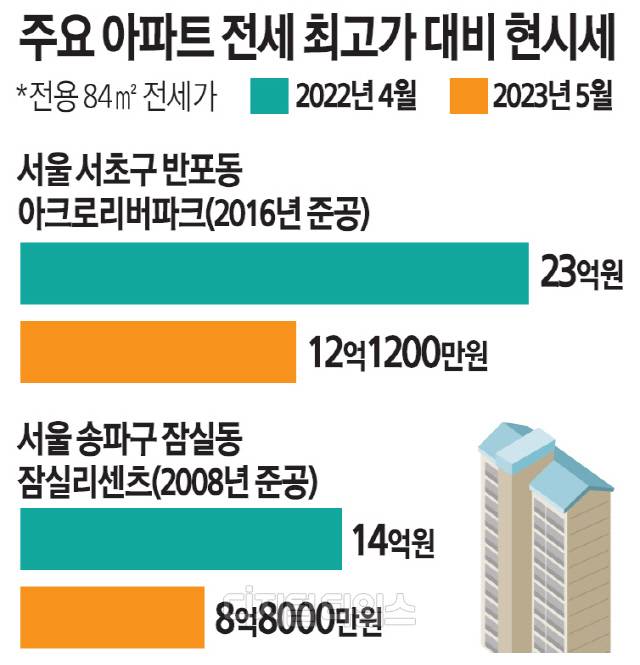 공인중개업계에 따르면 국내 최고가 아파트인 서초구 반포동 아크로리버파크 전용 84㎡ 전세가는 이달 12억원 대까지 떨어졌다. 이달 초 아크로리버파크 전용 84㎡ 16층 전세 매물은 12억1200만원에 임대차 계약을 맺었고, 19층 전세 매물도 12억5000만원에 거래됐다. 지난해 4월 같은 면적 전세 최고가 거래가 23억원이었던 것과 비교하면 이 아파트 전세 가격은 1년 새 10억원 이상 낮아진 것이다. 서울 강남권 최고가 아파트에서도 역전세난이 발생해 임차인 전세보증금을 반환받지 못하게 될 우려가 있다는 의미다.