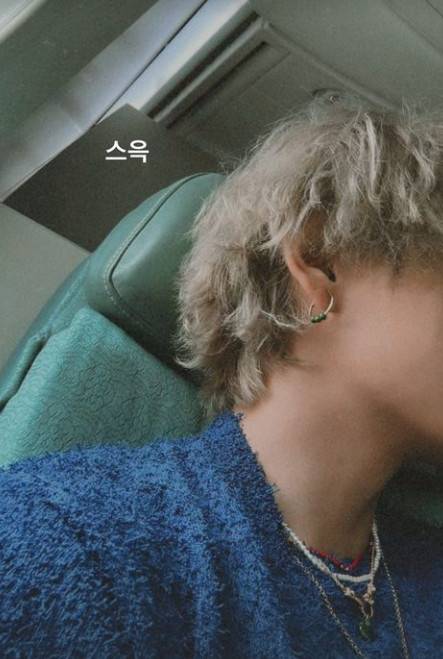 공개된 사진 속 뷔는 비행기에 탑승한 후 자신의 옆모습을 찍고 있다. 날렵한 턱선과 달라진 염색 머리 스타일이 눈길을 모은다.
