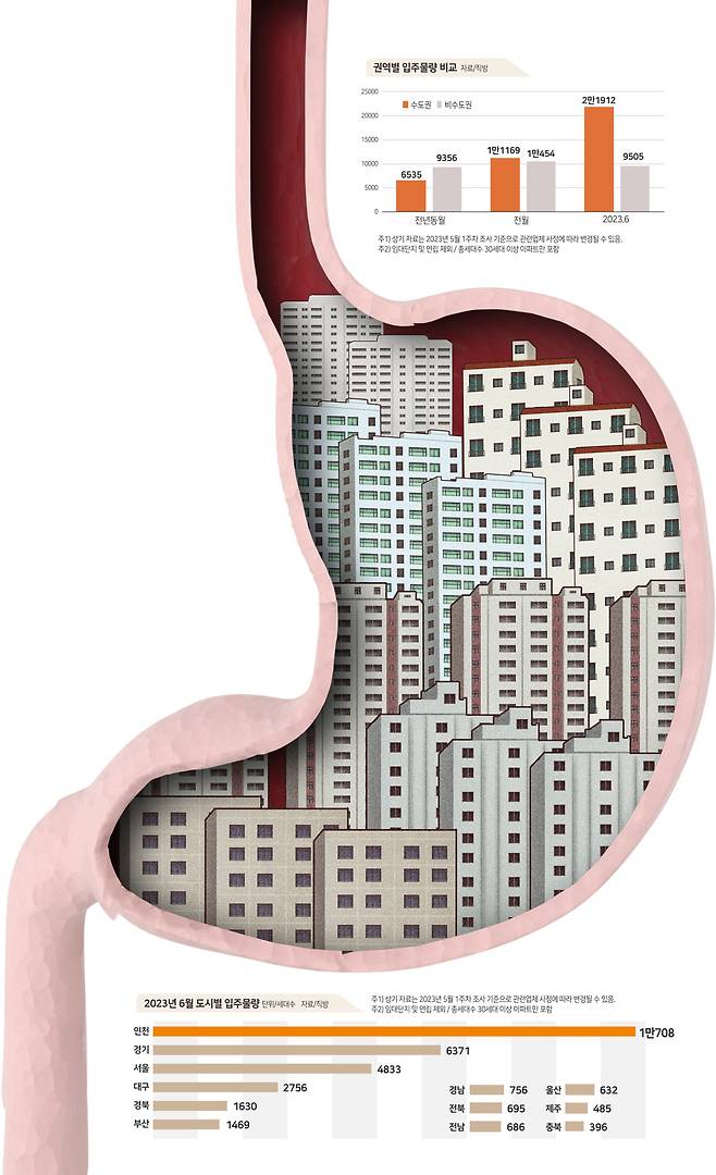 수도권이 2만 1912세대, 비수도권 9505세대로 수도권 비중이 높다. 수도권의 경우 전월 대비 2배 가량, 전년동기보다 3배 이상 많다. 2개월 동안 입주물량이 없었던 서울에서 4833세대가 입주하고 경기는 과천, 수원 등지에서 6371세대가 입주한다. 특히 인천은 1만708세대가 입주할 예정으로 2007년 8월(1만 1207세대)이후 가장 많은 물량이 공급된다. 비수도권은 전월보다 9% 가량 적은 9505세대가 입주하며 대구 2756세대, 경북 1630세대, 부산 469세대 등 순이다.